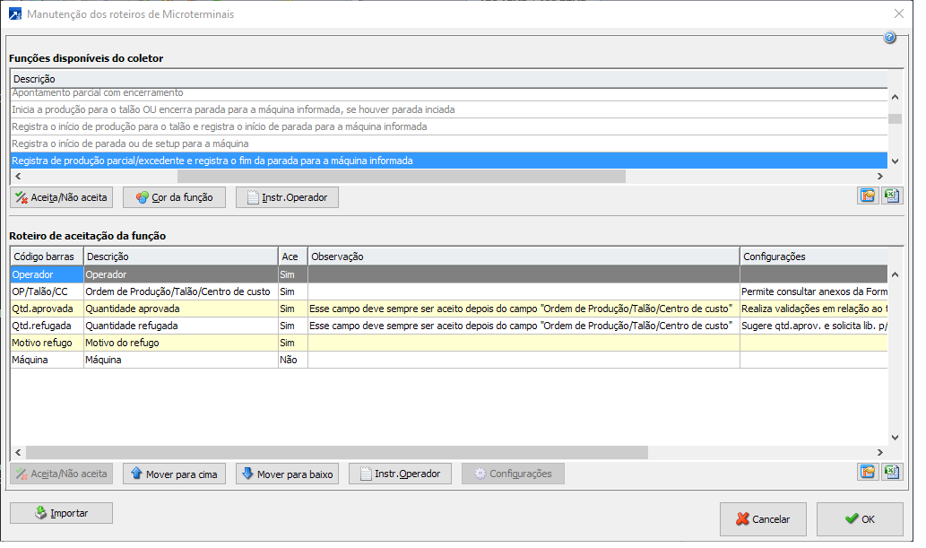 'Sugere máquina talão': Se estiver configurado como 'Sim' e caso for aceito na função, irá preencher automaticamente o campo de máquina com a primeira máquina programada do talão.
