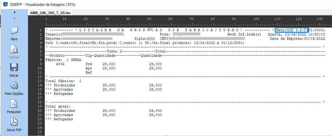 No SIGER® o registro do apontamento de produção é gravado na tabela "176-REGISTROS DE PRODUÇÃO POR TALÃO", que pode ser consultado a partir do menu GIN 2.3-S de Manutenção consolidada de registros de produção.