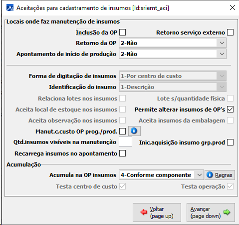 1.2-A, botão Aceitação p/ Cadastro, botão Insumos, "quadro" Acumulação, combo Acumula na OP insumos.