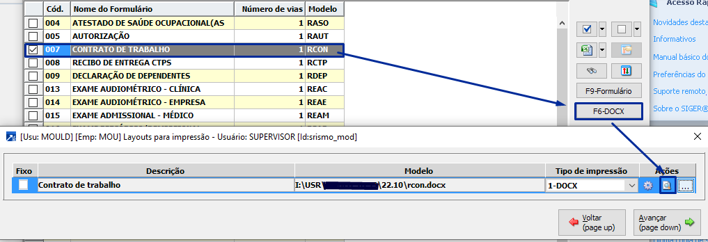 Exemplo: Como incluir parágrafo no contrato de trabalho, menu FPA 5.2-C, selecione o documento do contrato código 007, botão <F6-DOCX> e botão <Visualizar>.