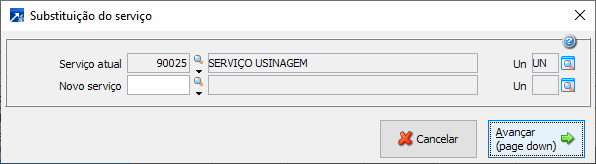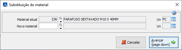 Substituir Permite substituir o materiais e serviços selecionado no grid. Substituição do material: Substituição do serviço: