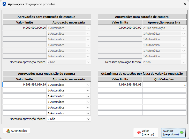 Configurações de aprovação do grupo de produtos.