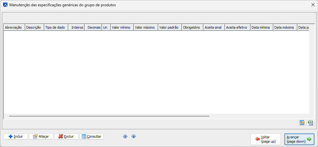Manutenção das especificações genéricas do grupo de produto.