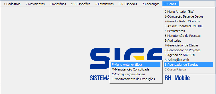 Disponível em todos os módulos, pelo menu 9.B, o agendador de tarefas, permite a criação de tarefas agendadas do SIGER, bem como seu monitoramento de execução, substituindo a necessidade de utilização do agendador de tarefas dao Windows.