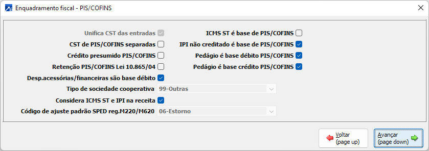 O objetivo dessa opção é calcular ou zerar o valor de dedução de PIS/COFINS nos movimentos de estoque considerando o enquadramento atual da empresa.