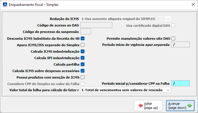 Parâmetros de empresa - Enquadramento fiscal - Simples
