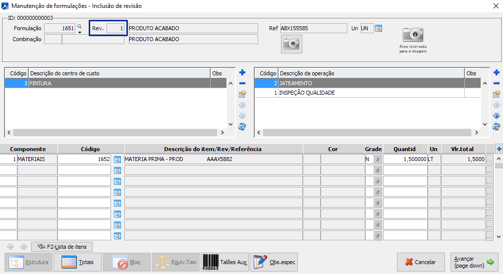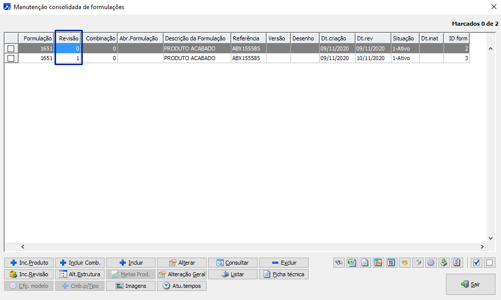Na manutenção consolidada de formulações disponível no menu 1.7-M utilizar o botão [Inc.Revisão] conforme indicado abaixo.