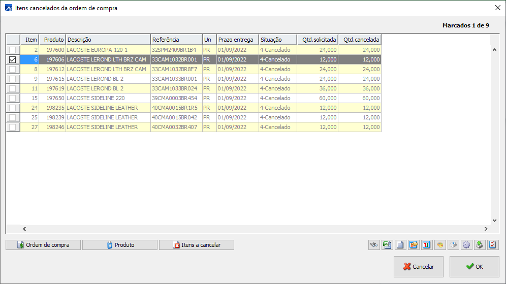 Após a confirmação na janela de itens cancelados da ordem de compra: