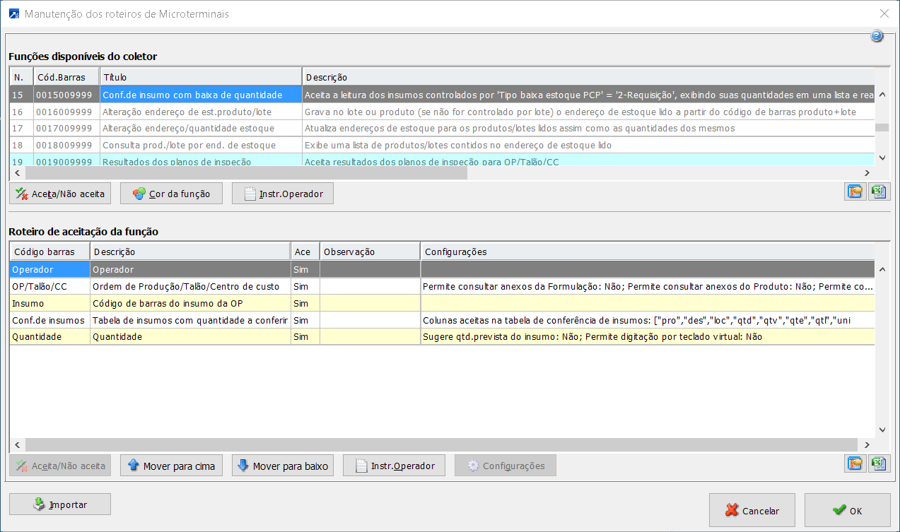 'Confirma a execução da função automaticamente': Se estiver configurado como 'Sim', ao ler toda a quantidade de todos os insumos da OP, vai confirmar a execução da função automaticamente.