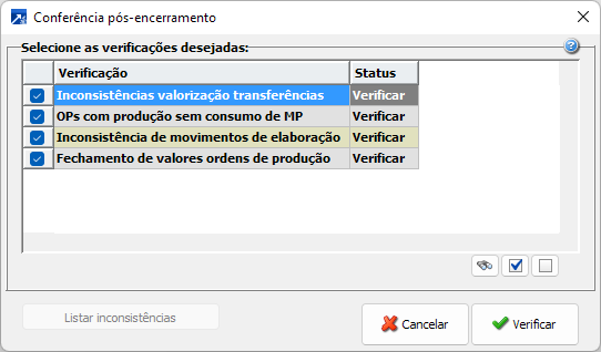Ao acessar o menu, o SIGER® já vai trazer selecionadas as verificações cabíveis de serem feitas após o encerramento mensal.