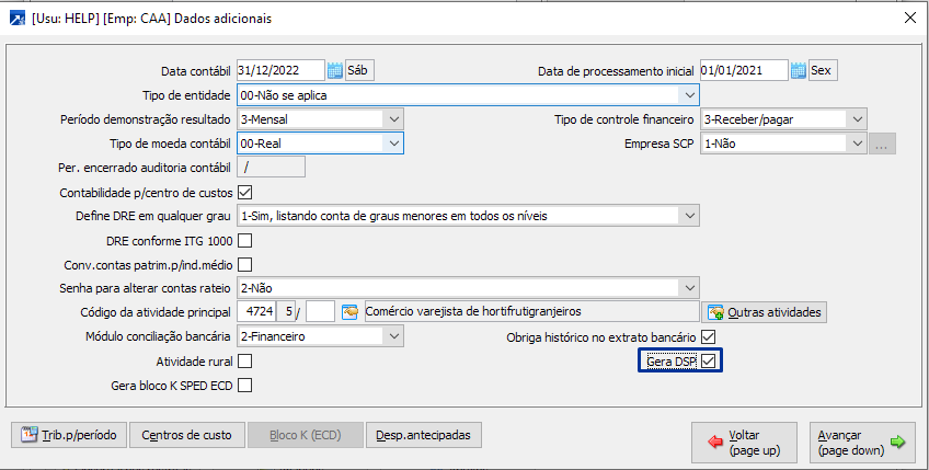 Para habilitar a geração do DSP na manutenção de empresas da contabilidade 1.2-A botão <Dados dos termos> o campo “Natureza do estabelecimento” deve ser configurado com o código 2134 (Cooperativa). Além disso, em <Dados adicionais> deverá ser marcada a check-box “Gera DSP”.