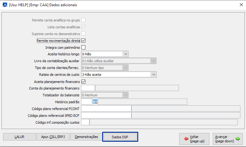 Nas contas contábeis de resultado é necessário configurar o tipo de participação das contas no contexto do DSP, as configurações do DSP nas contas contábeis estão nos Dados Adicionais do cadastro de contas para contas contábeis no botão <Dados DSP>. A configuração das contas pode ser efetuada individualmente nas contas pela rotina de alteração 1.6-A/1.6-H botão <Alterar>.