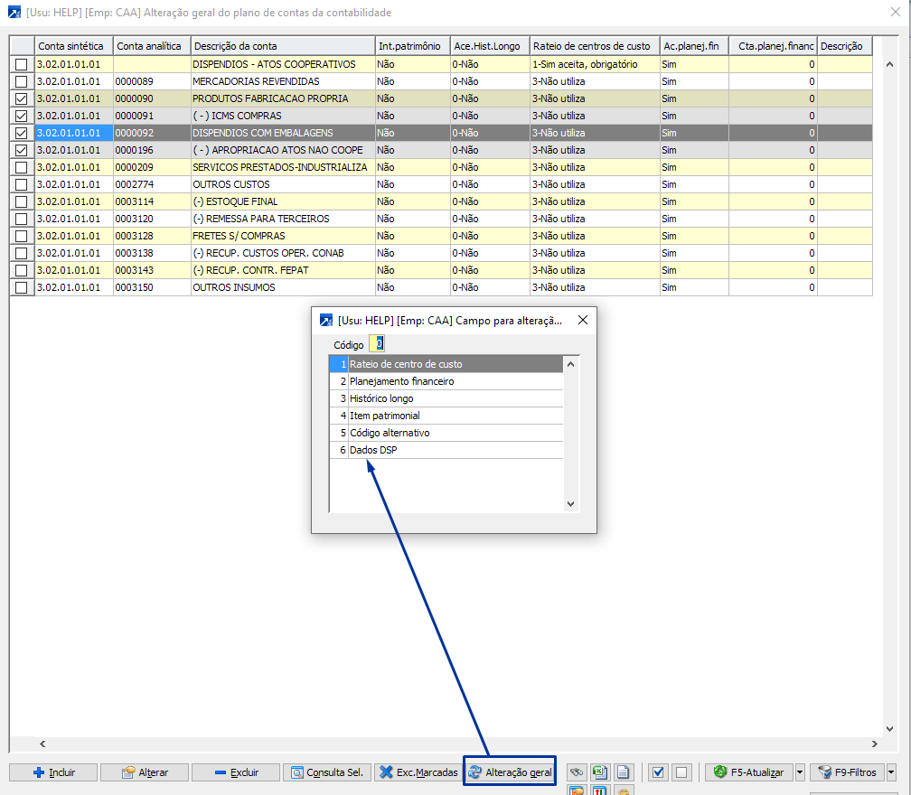 Também é possível configurar mais de uma conta por vez mediante a rotina de alteração geral disponível na rotina 1.6-H botão <Alteração Geral> opção 6-Dados DSP.