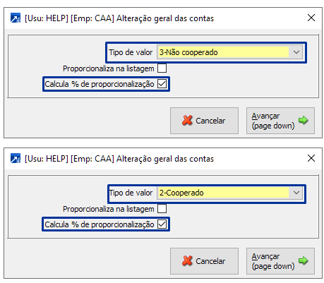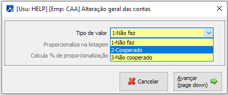 Calcula % de proporcionalização - Indica se a conta contábil é utilizada para o cálculo de proporcionalização dos atos na apuração do DSP. Obrigatoriamente devem ser configuradas contas do tipo Cooperado e Não Cooperado sendo essencial configurar pelo menos uma conta de cada tipo para cálculo de proporcionalização. Nas contas deverá ser marcada a check box “Calcula % de proporcionalização”.