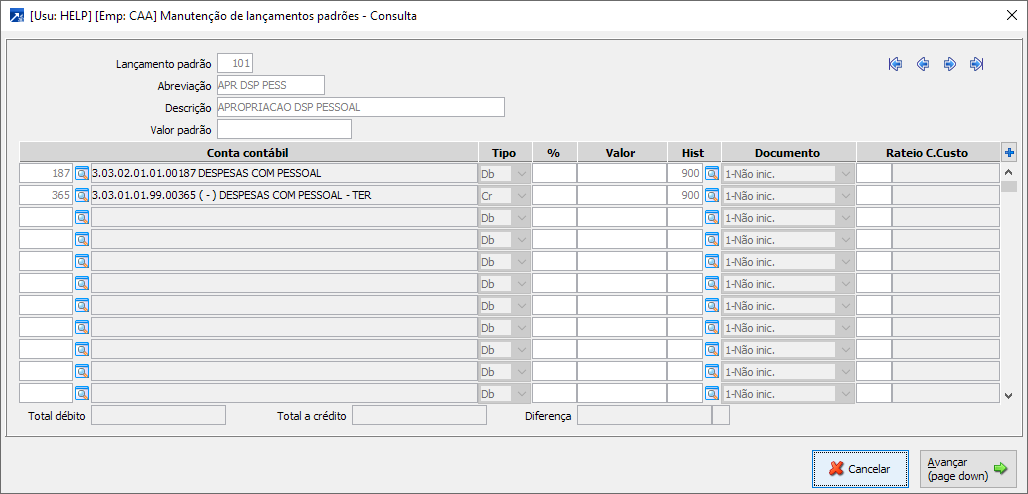 Para que o SIGER® possa criar automaticamente os lançamentos contábeis de apropriação do Ato Não Cooperado, é obrigatório no menu 1.9-I a inclusão de lançamentos contábeis padrões, abaixo segue um exemplo de lançamento padrão para apropriação de Dispêndios com Pessoal para Despesas com Pessoal.