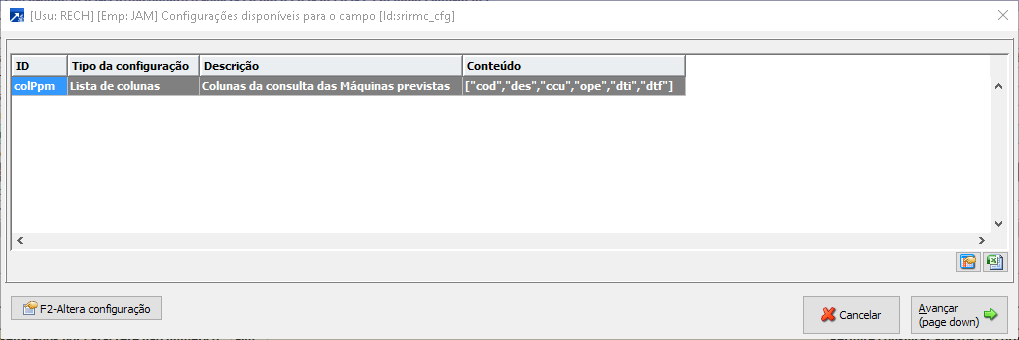 Tabela com as máquinas previstas da OP consultada. As colunas a serem exibidas podem ser configuradas conforme imagem abaixo.