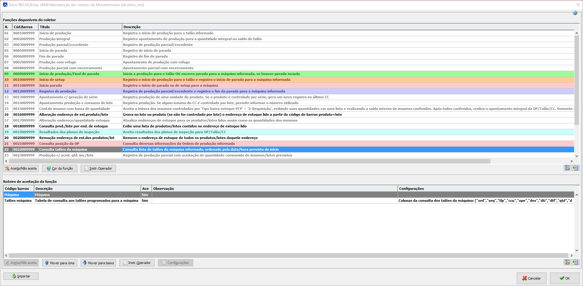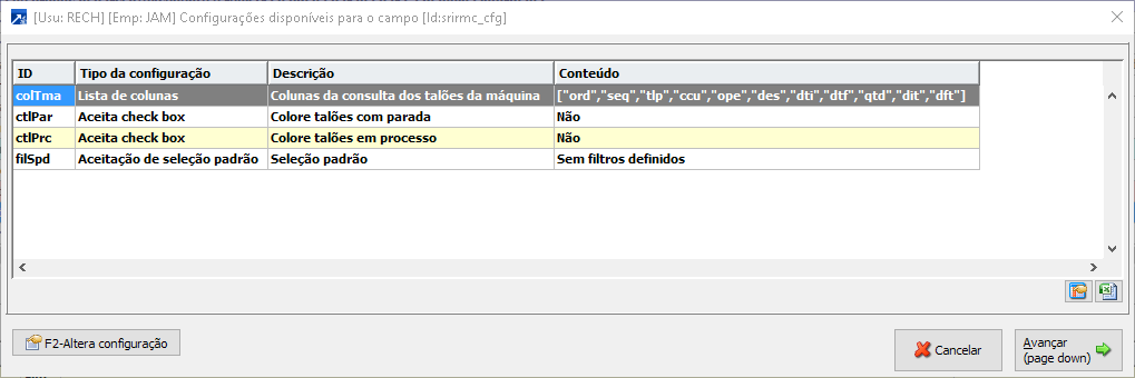 'Lista de colunas': Colunas a serem aceitas na consulta dos talões da máquina.