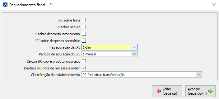 Configuração: Estoque, menu 1.2-A, botão [Dados Adicionais], botão [Enquadramento Fiscal], botão [IPI], campo "Faz apuração de IPI".