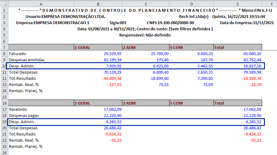 O demonstrativo controle por centro de custo do planejamento financeiro possibilita a análise das receitas e despesas por centros de custos.
