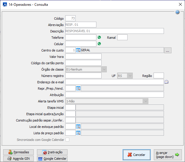 O campo "Responsável" acessa a tabela por empresa 14-Operadores, conforme demonstrado na imagem a seguir.