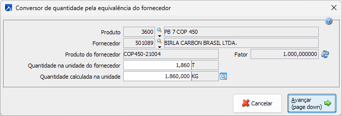 Dica: utilize o atalho "F3-Fator de conversão" para calcular a quantidade do item da ordem de compra a partir do fator de conversão cadastrado nas equivalências do produto para o fornecedor. Aplicável quando o fornecedor controla o produto em unidade de medida diferente da unidade do produto cadastrado no SIGER®. + Saiba mais