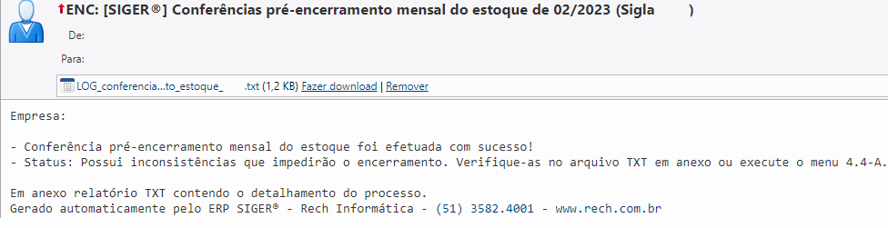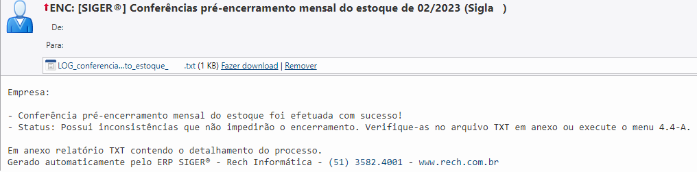Outro diferencial é o envio de um e-mail para o responsável pelo estoque informando o resultado do processo, anexado arquivo contendo o detalhamento do processo e eventuais inconsistências.