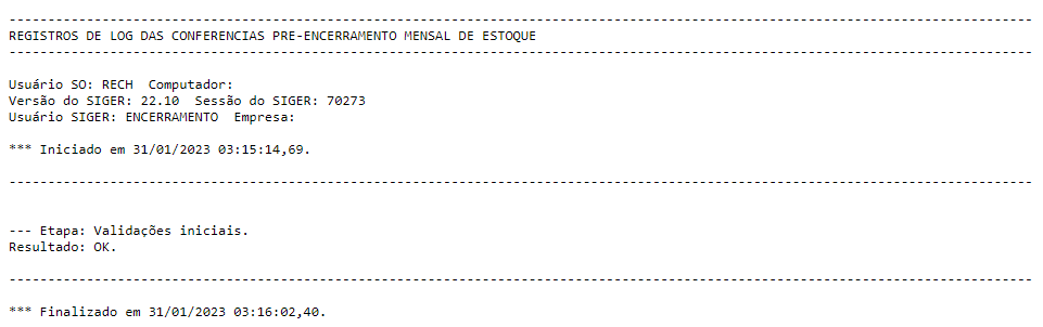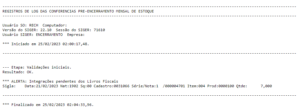 Neste caso a empresa do Estoque estava no mês de Fevereiro, logo o encerramento seria para que fosse para Março. Como há uma pendência de integração de Fevereiro (02/2023), o SIGER® consegue seguir o encerramento, pois permite pendências de integração do mês atual da empresa do estoque para que o encerramento de estoque não tranque. A indicação, de qualquer forma, é ajustar as pendências para não acumular para o próximo mês.