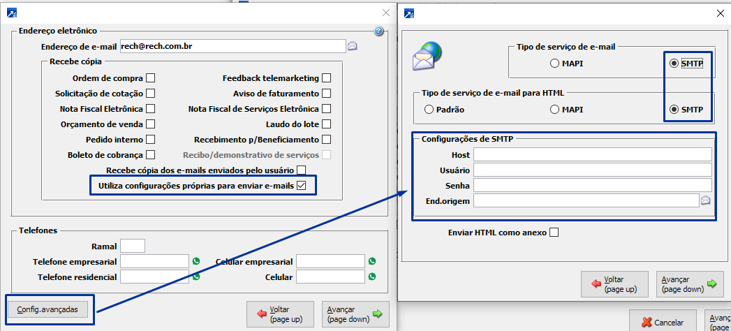 Para isto, deve ser marcada a check-box "Utiliza configurações próprias para enviar e-mails", após isto o botão "Config avançadas" será liberado. Ao clicar neste botão, uma nova tela será aberta e nela será necessário marcar as duas opções "SMTP" e também colocar os dados de "Configurações de SMTP".