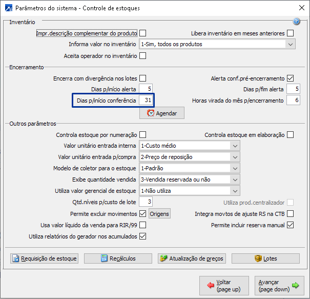 No menu EST 1-1-P, botão [Estoque], campo "Dias p/início conferência" é configurado a quantidade de dias CORRIDOS para iniciar a conferência automática de pré-encerramento mensal (envio do relatório de conferência pré-encerramento EST 4.4-A).
