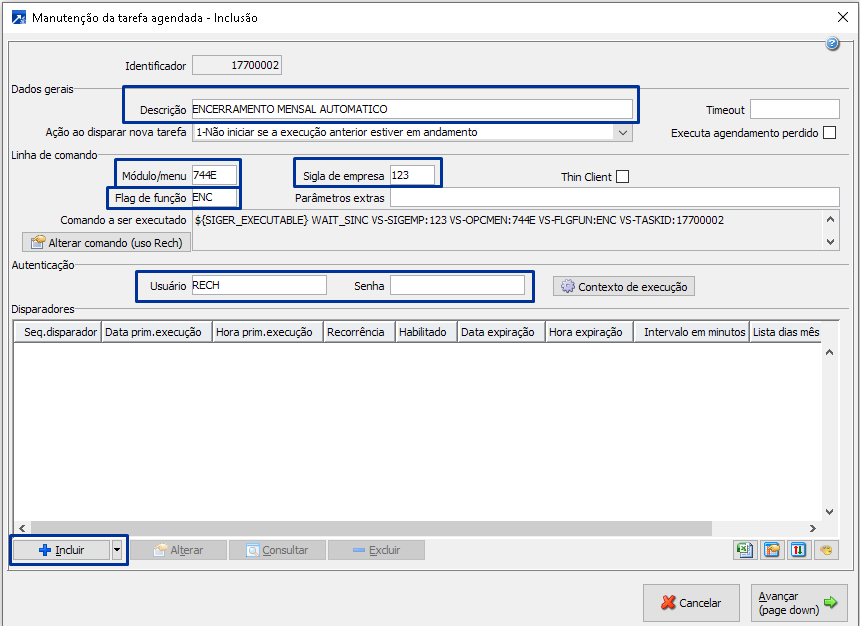 Abaixo vamos demonstrar um exemplo de como deve ser a inclusão de uma tarefa referente ao encerramento automático.