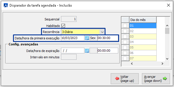 Data/hora da primeira execução: Na parte da "data" pode ser indicado o dia de amanhã e na parte do horário, normalmente, indicamos 00:30h.