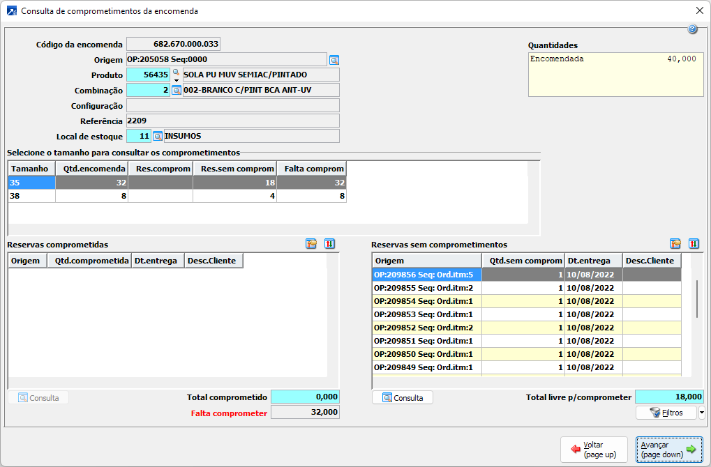 Permite visualizar os comprometimentos das reservas com a encomenda do estoque. + Saiba mais