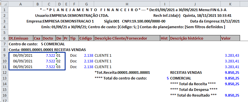 1-Data de emissão: Classifica os documentos pela data de emissão do documento, nessa opção, caso o documento possua desdobramentos ou parcelas, será listado o valor de todos os desdobramentos e/ou parcelas, pois a data de emissão será a mesma, conforme demonstrado exemplo no relatório FIN 6.3-A.