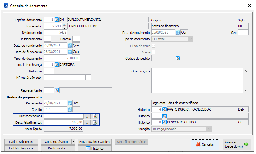 Os descontos ou juros são os valores informando nos seguintes campos do documento do financeiro, conforme exemplo na imagem a seguir.