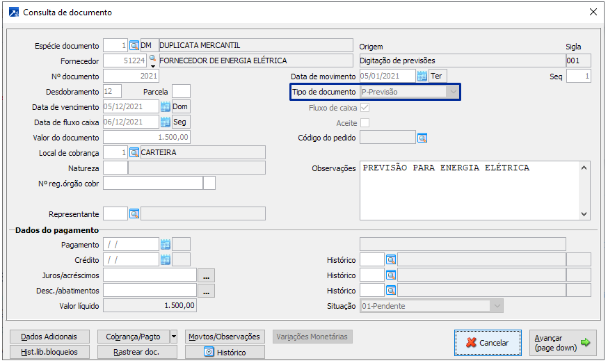2-Previsões: Lista somente documentos tipo P-Previsão, os documentos inclusos no menu FIN 2.2-I.