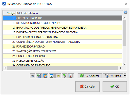 Abre a seleção de relatórios disponíveis no gerador para tabela exibida no grid, permitindo filtrar relatórios de outras tabelas a partir dos filtros.