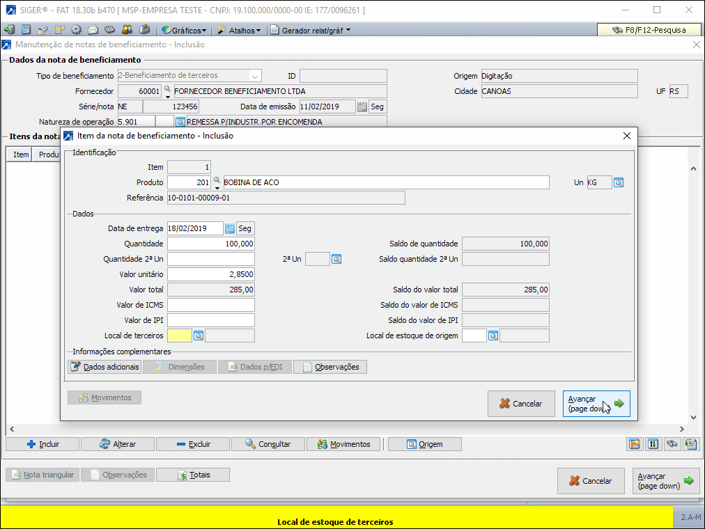 Exemplo de operação: Inclusão de nota de beneficiamento