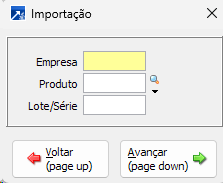 Nessa é possível se selecionar a empresa, produto e lote/série que se deseja importar os dados.