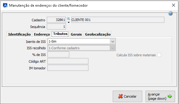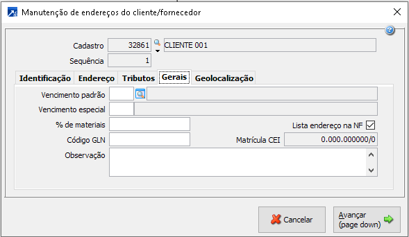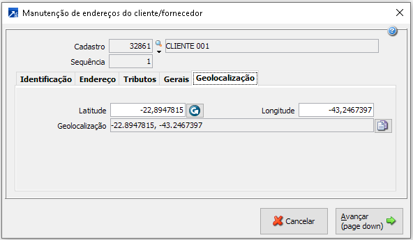 Os campos de latitude e longitude são carregados a partir dos dados de endereço informados na aba "Endereço". No entanto, se necessário, a latitude e longitude podem ser informados manualmente. A cada informação do endereço que for alterada vai tentar recarregar a latitude e longitude. Para 'forçar' que sejam recarregados esses campos pode ser usado o botão ao lado do campo de latitude.