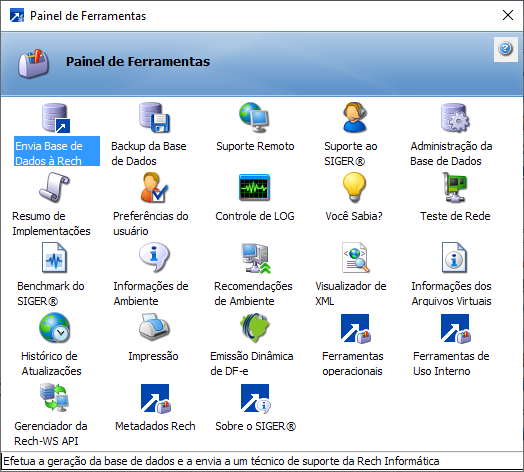 Esta janela apresenta vários recursos adicionais do SIGER®, tais como, Envio de base de dados à Rech, Geração de cópia da base de dados, Suporte remoto, Informações do cliente, Informações do SO/computador, etc.