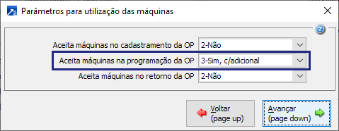 GIN 1.2-A, botão <Aceitações p/Cadastro>, botão <Máquinas>, campo "Aceita máquinas na programação da OP" para a opção "3-Sim, c/adicional"