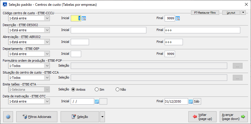 Esse botão acessa a "Seleção padrão - Centros de custo (Tabelas por empresas)", possibilitando a seleção dos centros de custos para consulta dos saldos do planejamento.