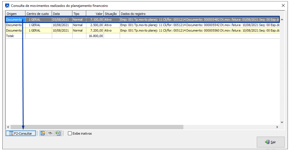 No grid "Consulta de movimentos realizados do planejamento financeiro" é possível acessar os registros dos movimentos, detalhando a origem do mesmo, para isso selecione o registro e clique no botão <F2-Consultar>.