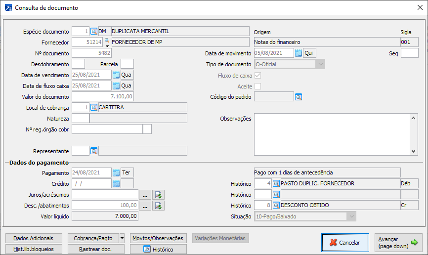 Este botão acessa o detalhamento do movimento realizado da conta selecionada no grid, possibilitando o rastreamento do lançamento/movimento.