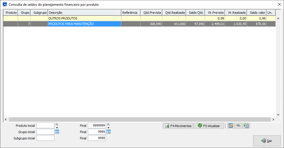 Este botão atualiza ou recarrega os saldos do planejamento financeiro, sem a necessidade de fechar a consulta e acessa-la novamente, basta selecionar a função F5 ou o botão [F5-Atualizar].