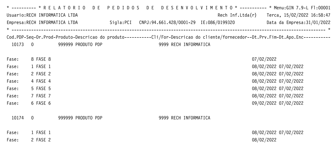 Gerado através do menu 7.9-L o SIGER® irá listar as informações do PDP agrupando através do código do PDP e descrevendo as informações das fases utilizadas neles.