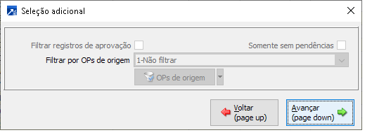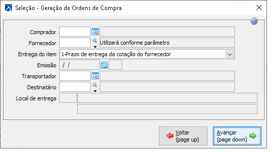 Para geração da ordem de compra é aceita a janela de seleção a seguir: