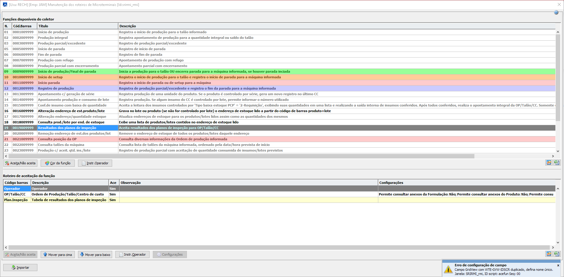 '2-Não controla': Quando a empresa estiver configurada para não controlar operador, esse campo não será aceito na função.