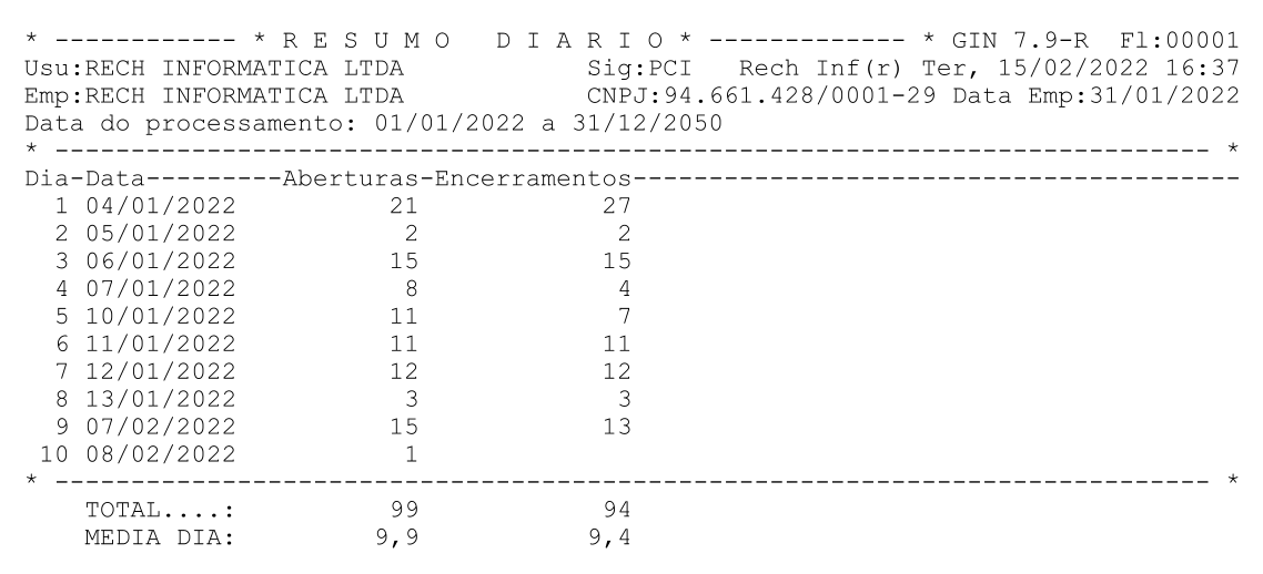 Total: Lista o somatório total das aberturas e encerramentos separados por colunas.