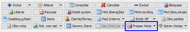 Na janela de Gerenciamento de Pedidos é possível configurar o botão da Preparação da nota fiscal. Esta rotina tem um funcionamento bastante semelhante ao menu FAT 6.4 (Junção Automática de Pedidos). A principal alteração a ser destacada é em relação ao código do pedido, que se mantém o mesmo nas baixas parciais.